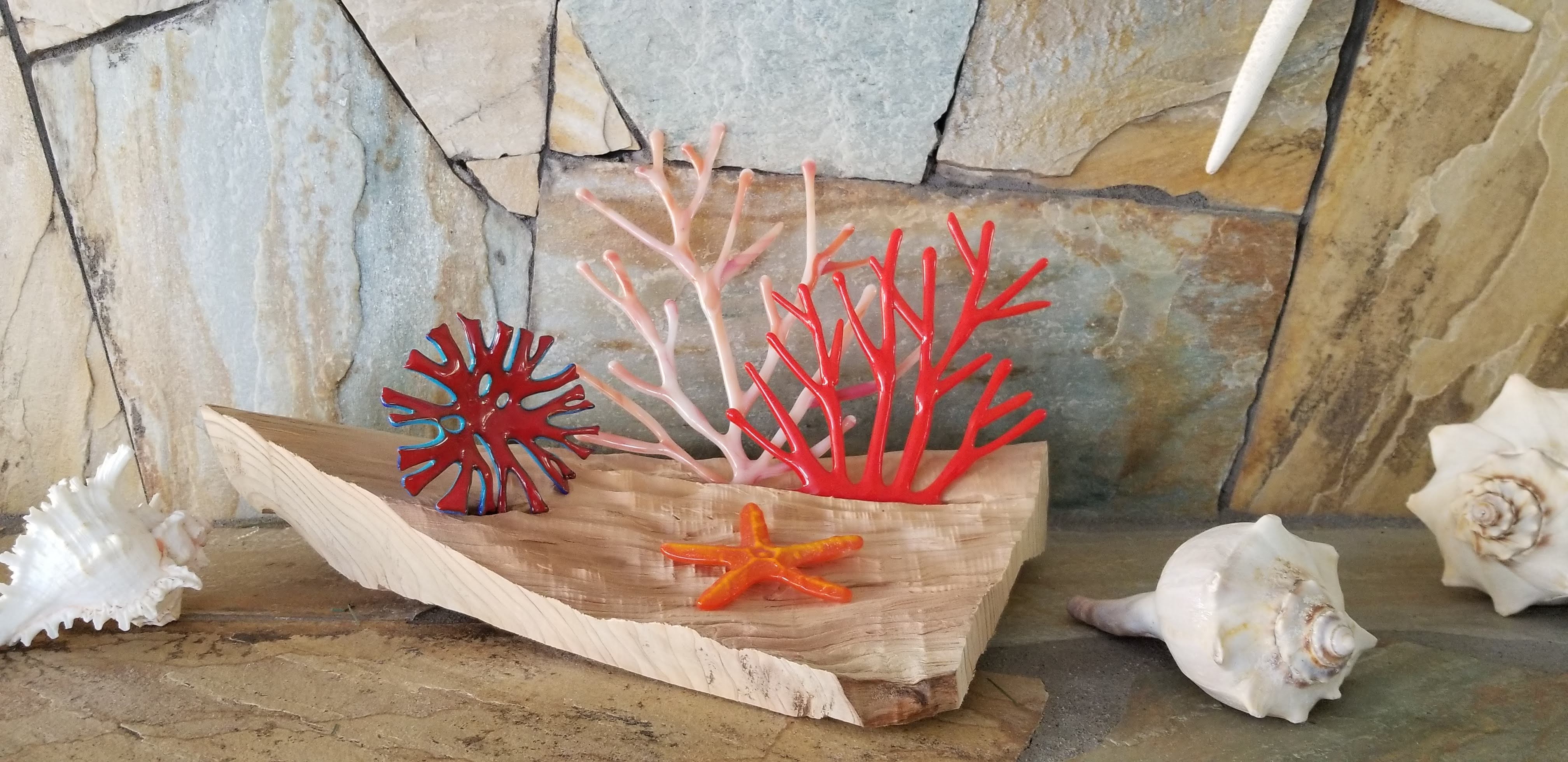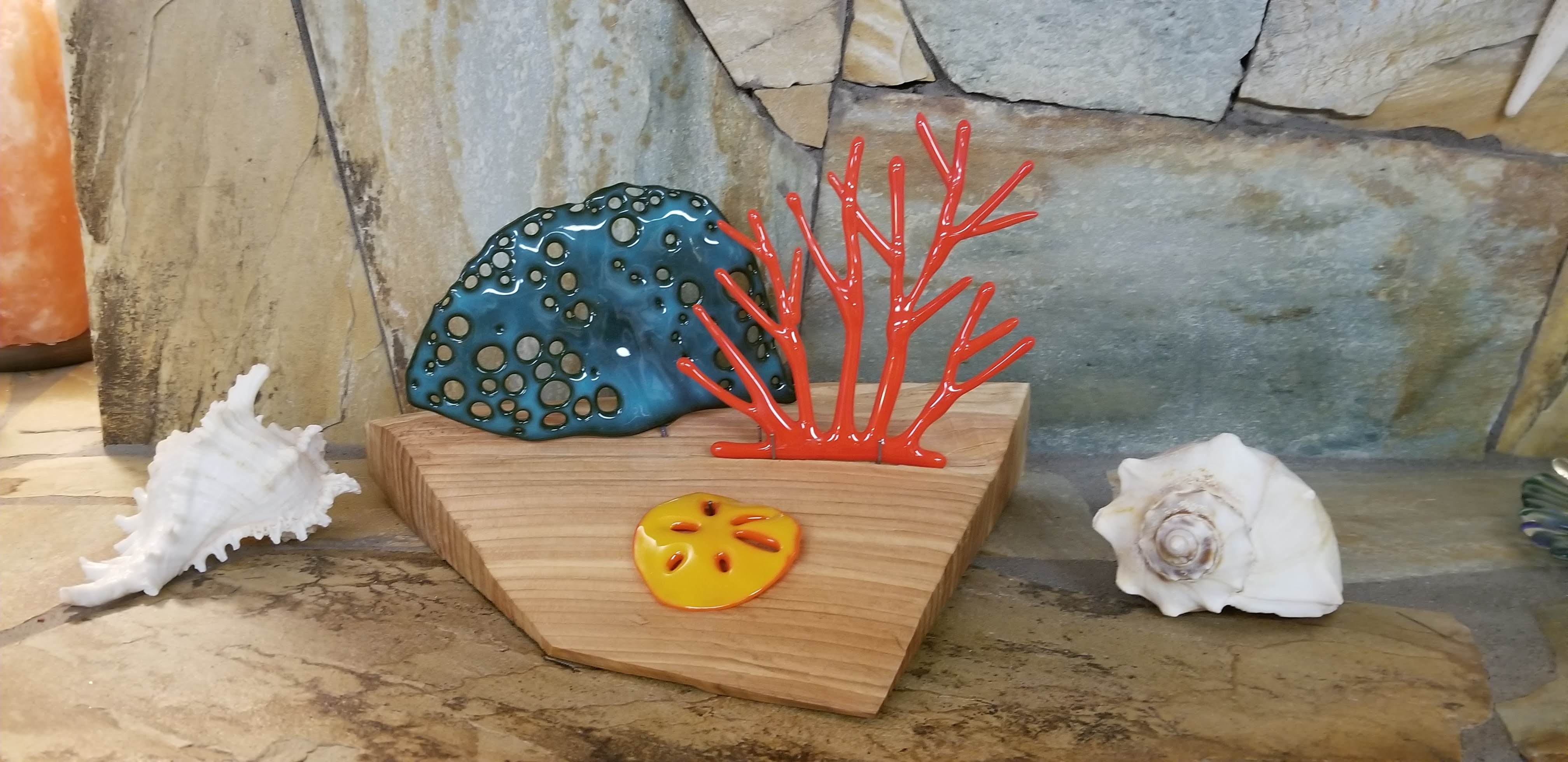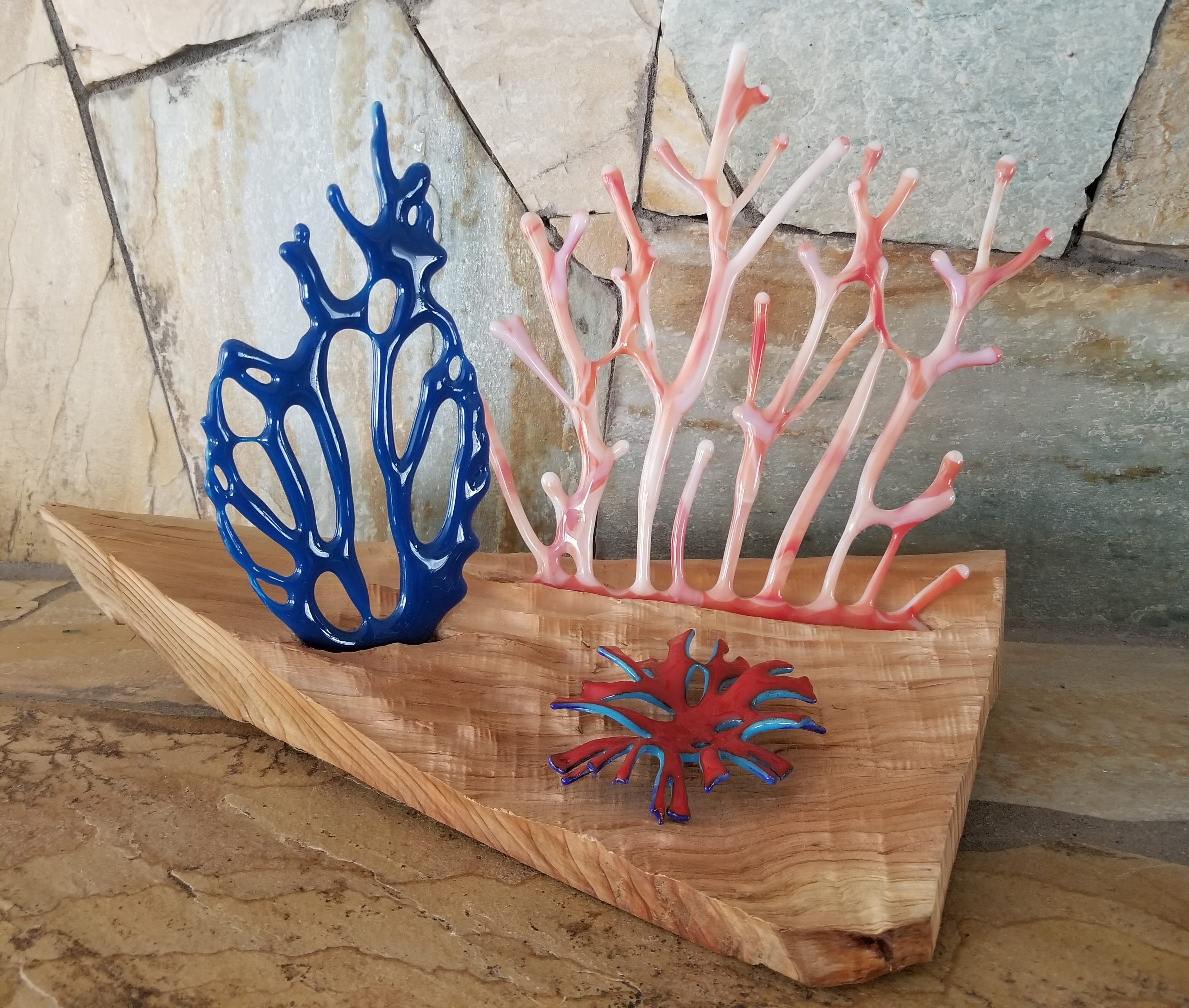 Coral Sea Sculpture, on a wood base $129 Wood base is 43 cm x 24 cm and glass is 24 cm high. Glass can be taken out for shipping, storage