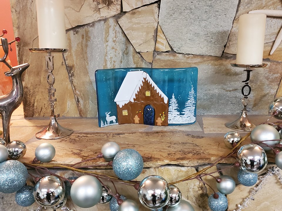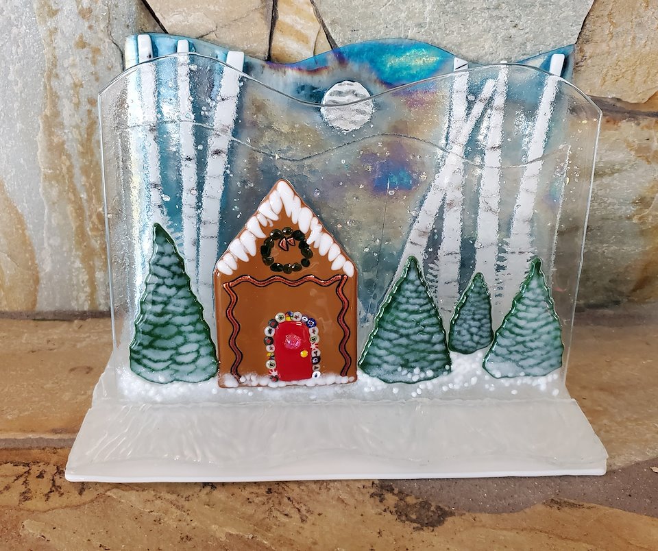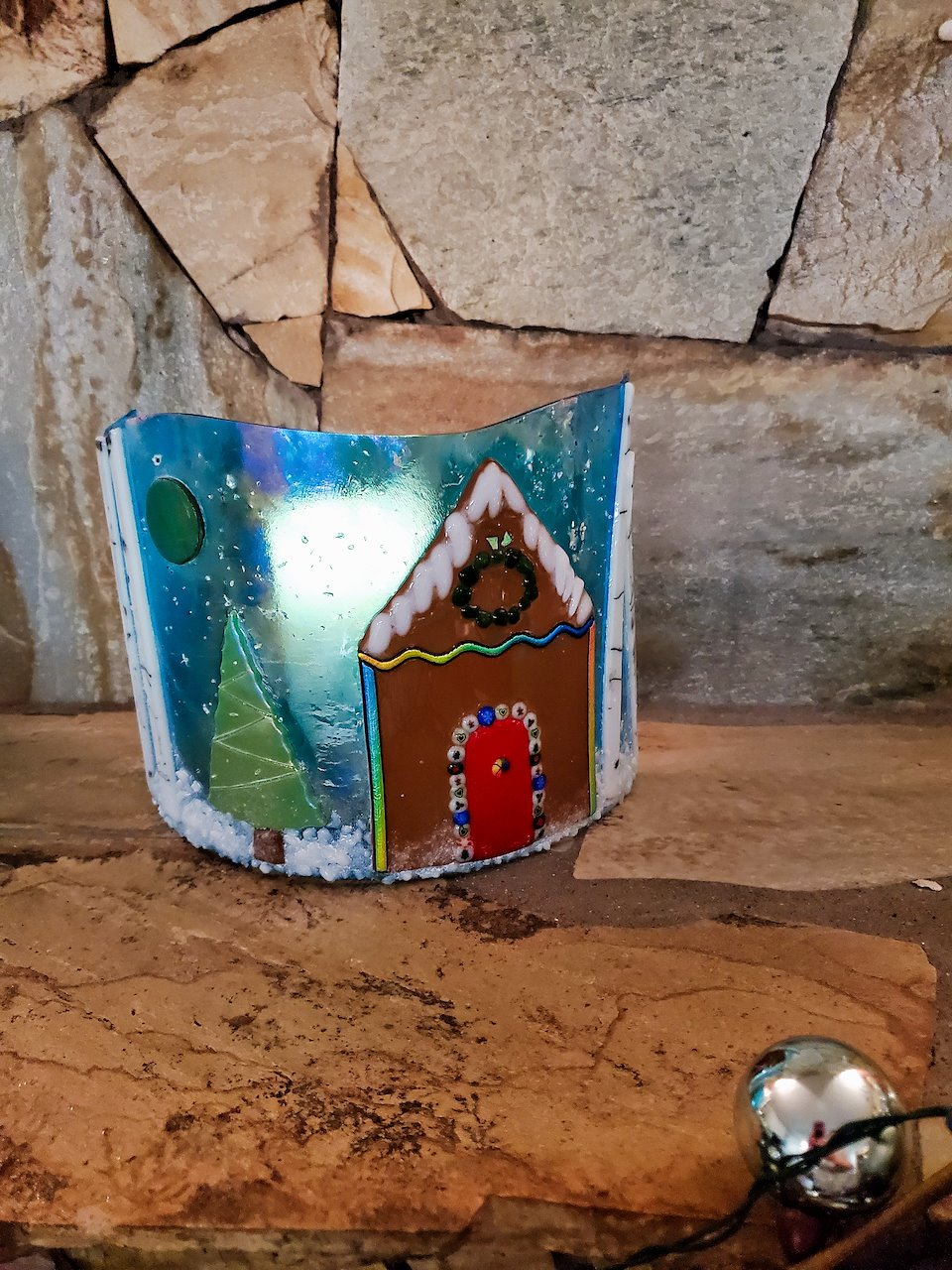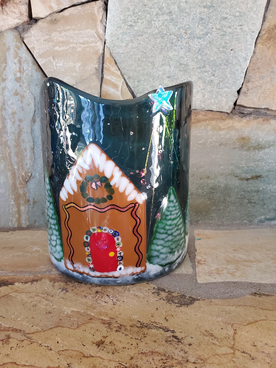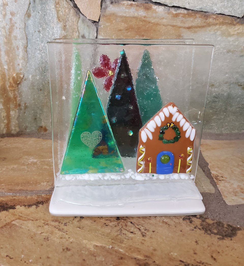 This Candle Screen with a gingerbread house has a beautiful textured rainbow iridescent base. The candies on the gingerbread house are murrini of various types, tiny hearts, poinsettas and gingerbread men. The trees are also made of iridescent glass that shimmer in the light. This is a truly spectacular one of a kind piece. It's a big one, 12 x 12 inches. $129