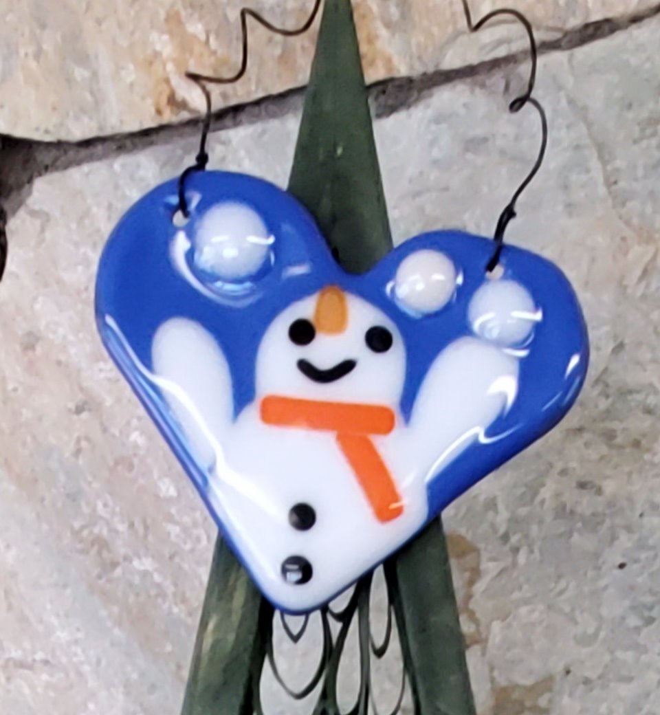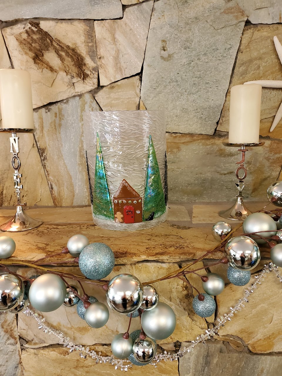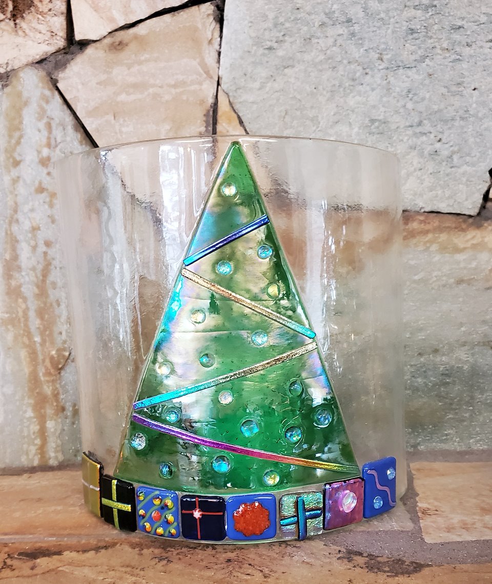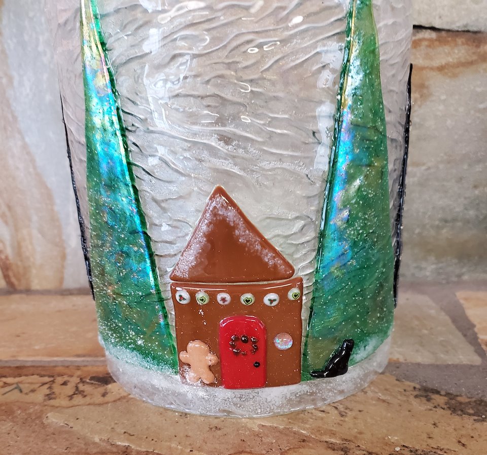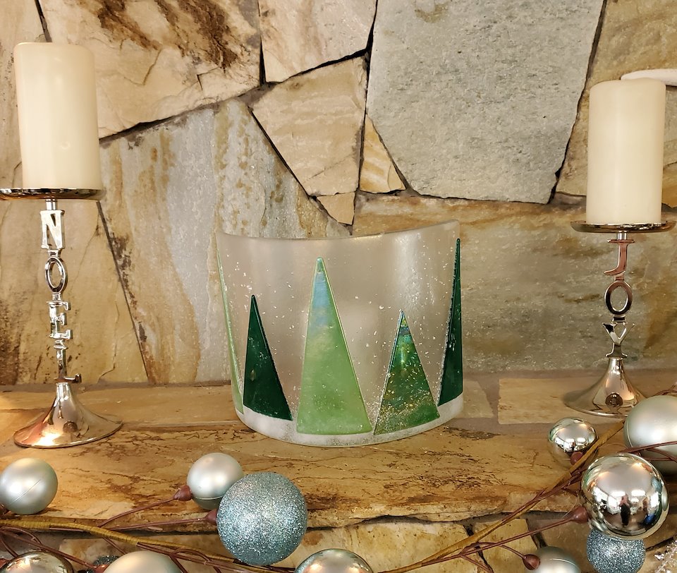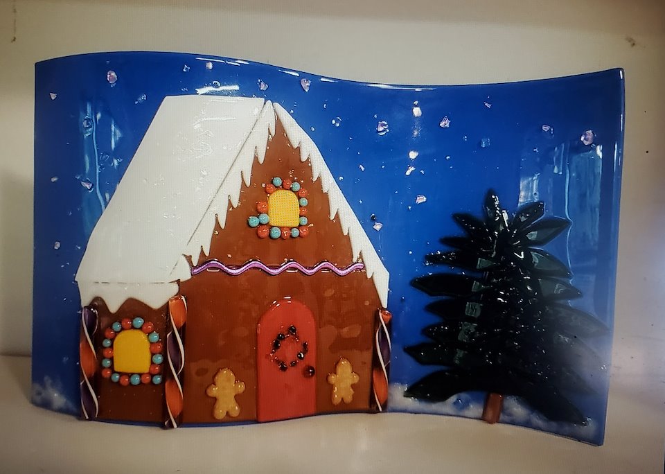 This Candle Screen with a gingerbread house has a beautiful textured rainbow iridescent base. The candies on the gingerbread house are murrini of various types, tiny hearts, poinsettas and gingerbread men. The trees are also made of iridescent glass that shimmer in the light. This is a truly spectacular one of a kind piece. It's a big one, 12 x 12 inches. $129