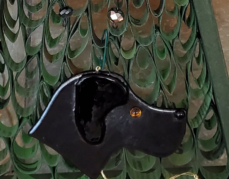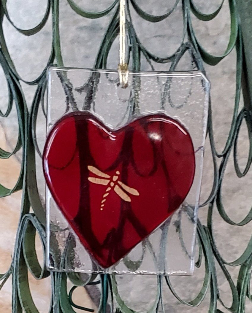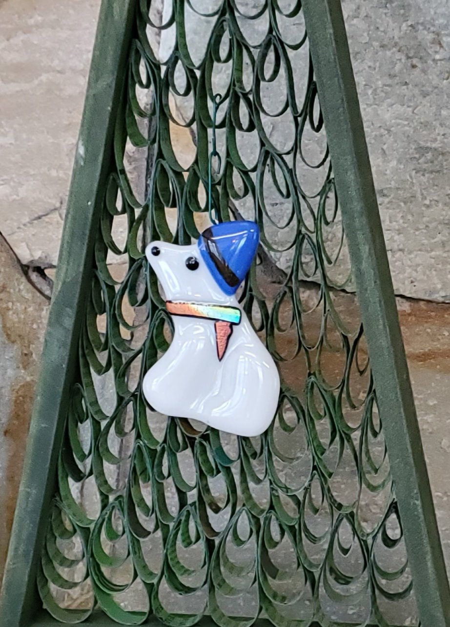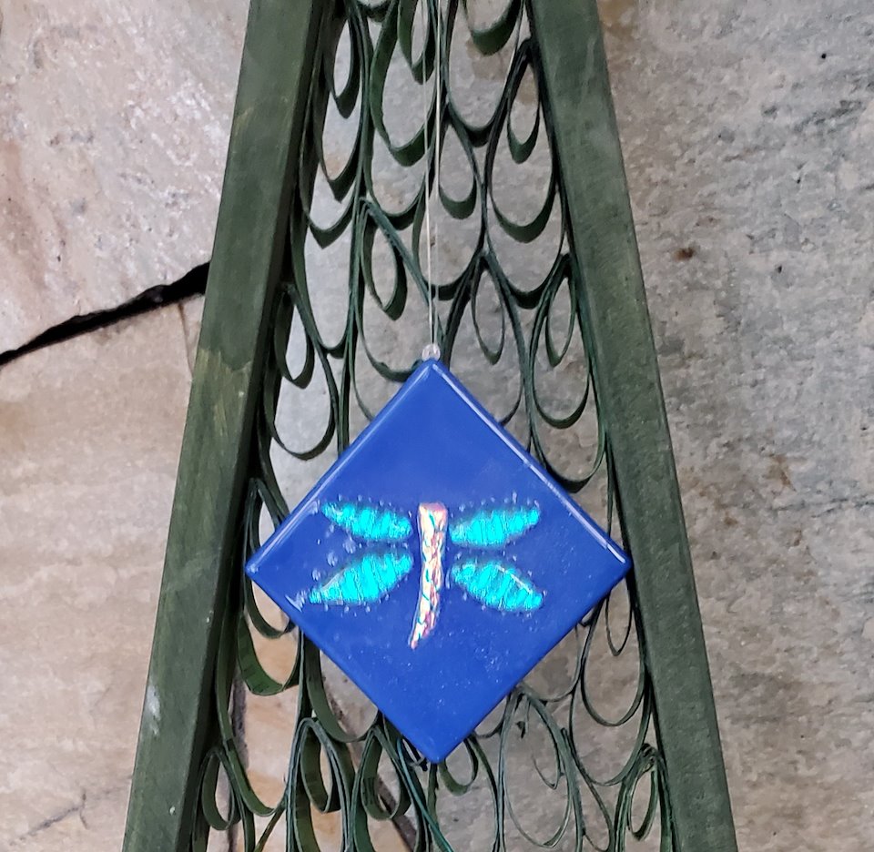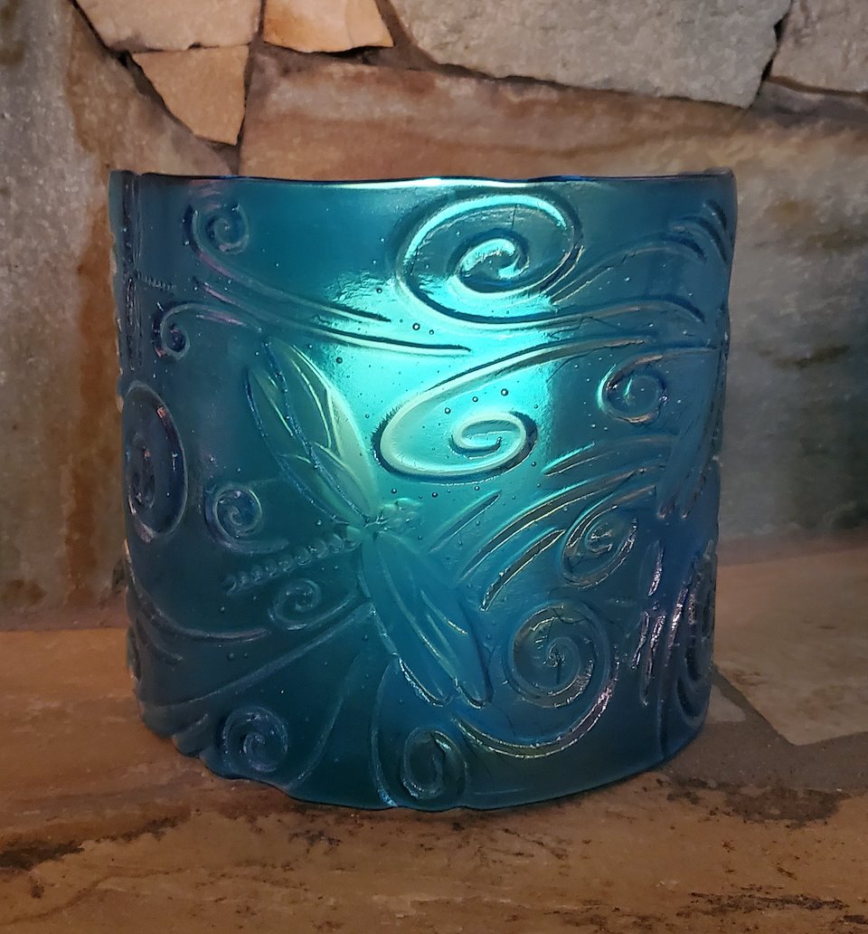 This Candle Screen with a gingerbread house has a beautiful textured rainbow iridescent base. The candies on the gingerbread house are murrini of various types, tiny hearts, poinsettas and gingerbread men. The trees are also made of iridescent glass that shimmer in the light. This is a truly spectacular one of a kind piece. It's a big one, 12 x 12 inches. $129