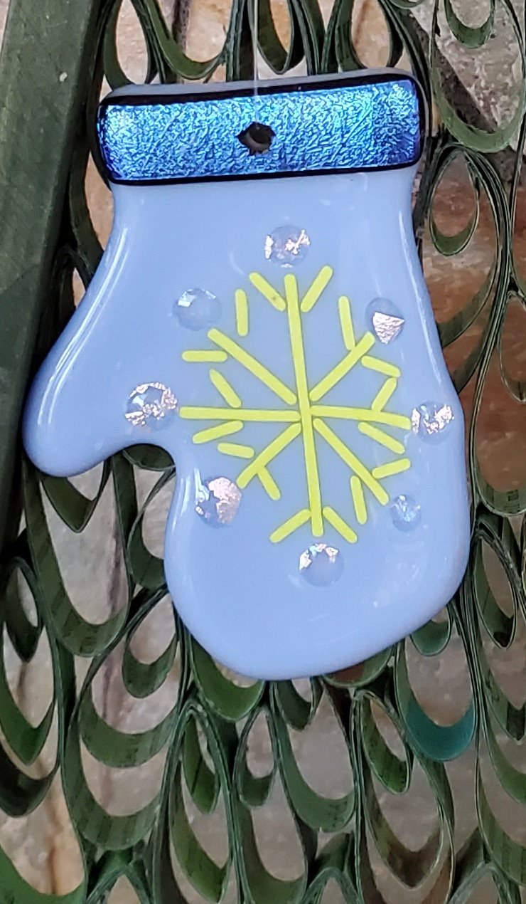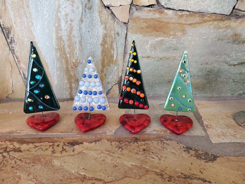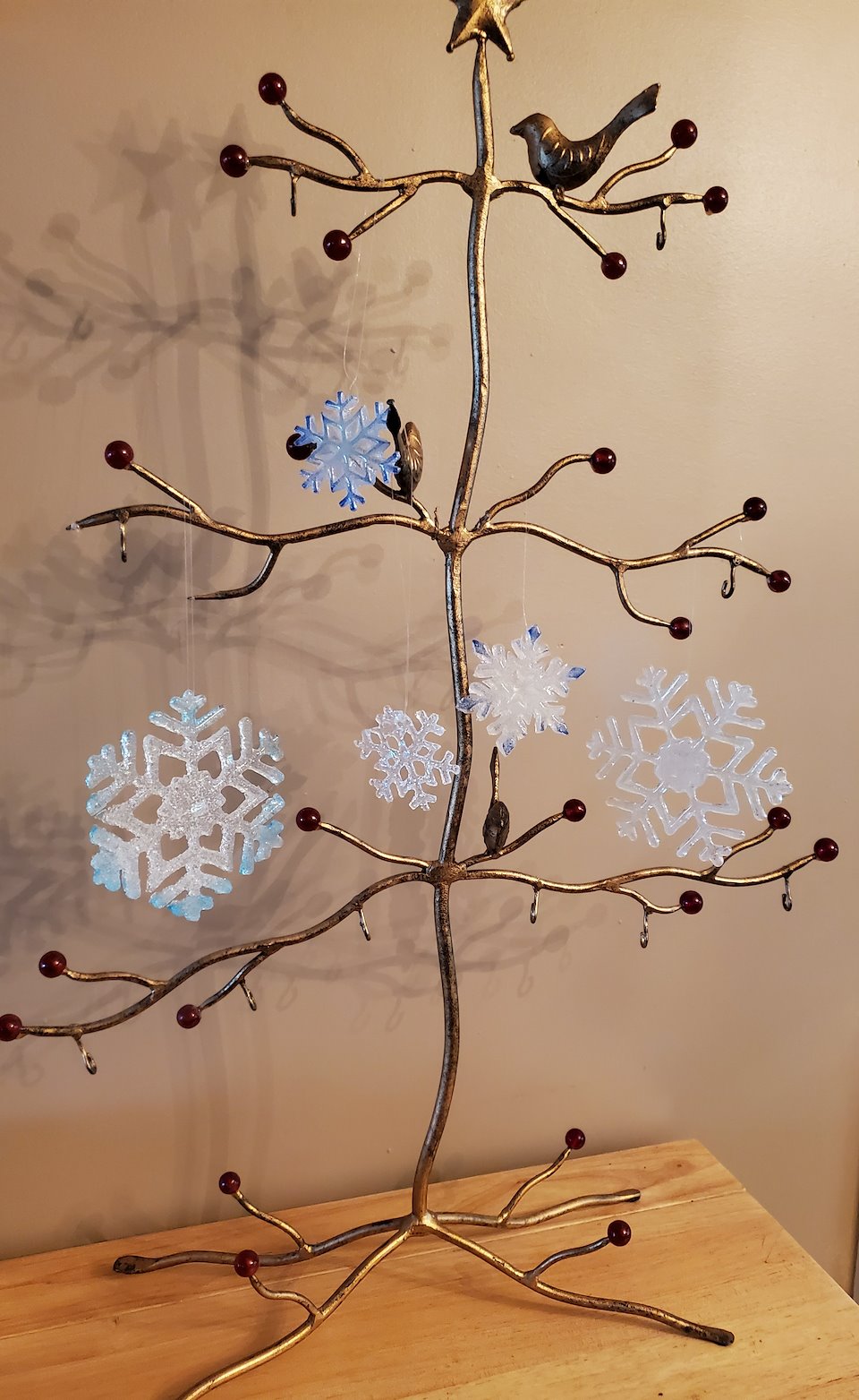 The trees in the snow are also on an iridescent base, with dichroic snowflakes that will sparkle when the light shines on them and a small snowflake next to the middle tree. The trees are also iridescent glass to add to the sparkle.