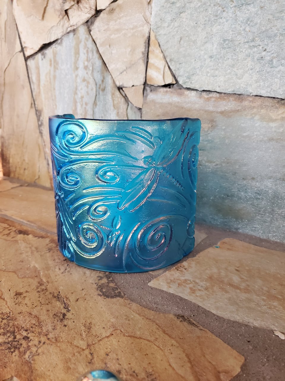 3 layers of glass, back panel is rainbow iridescent blue glass with a