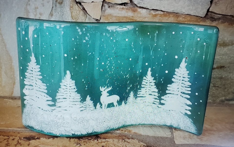 Snow Scene on Iridescent light blue glass 28 x 17 cm $89